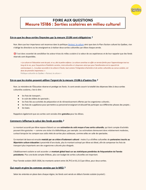 - Voici une foire aux questions pour en savoir davantage sur la MESURE 15186 – Sorties scolaires en milieu culturel.