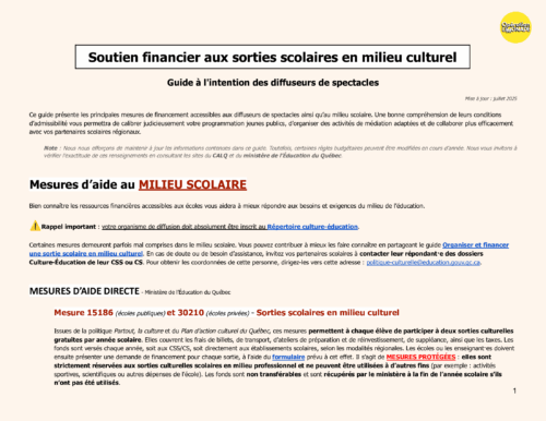 - Voici un guide pour vous aider à mieux comprendre les mesures d’aide financière qui s’appliquent aux sorties scolaires en milieu culturel.