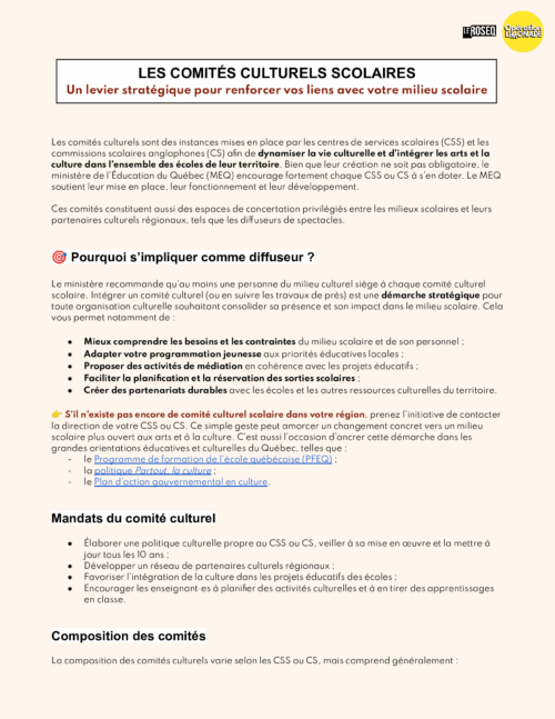 - Les comités culturels scolaires des CSS et CS jouent un rôle clé dans l’intégration de la culture à l’école et dans le développement de liens durables entre les milieux culturels et éducatifs. Découvrez comment vous impliquer dans ces instances stratégiques et contribuer activement à la vie culturelle des écoles de votre territoire.