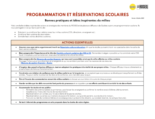 Voici une boîte à idées inspirée des actions et stratégies des membres du ROSEQ et de plusieurs diffuseurs du Québec ayant une programmation scolaire.